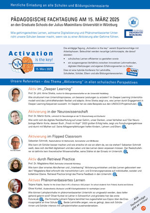 Die eintägige Tagung „Activation is the key“, die am 15.3.2025 an der Universität Würzburg statt findet, vereint Expertenvorträge mit Arbeitsphasen, in denen praktisches Material für den eigenen Unterricht erarbeitet wird. Beleuchtet werden neuartige Lehrkonzepte, die darauf abzielen: